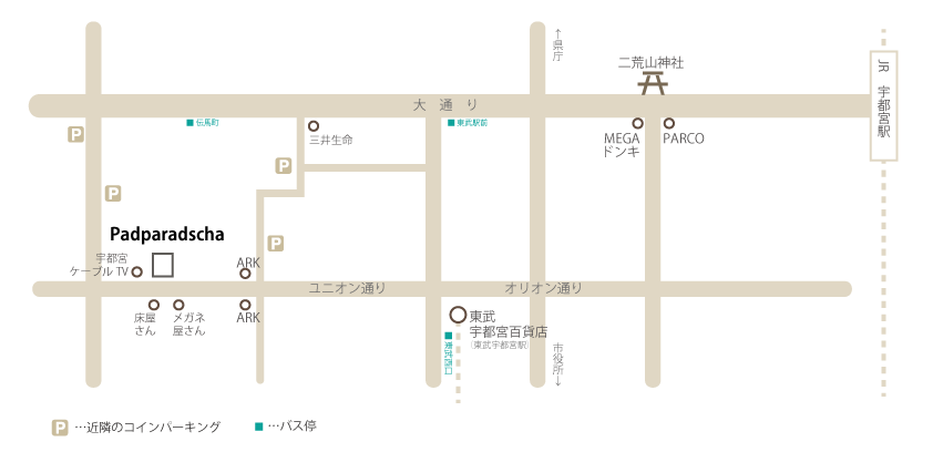 Padparadschaは、東武宇都宮駅から西にのびるユニオン通り商店街の真ん中あたりにあります。
